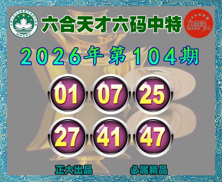 104期:《六合天才》 🐓六码中特🐓【01.07.25.27.41.47】开:0113:00公开验证